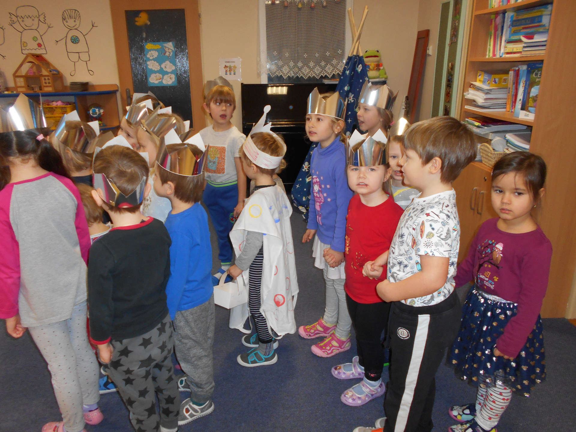 Vyrobily jsme si papírové koruny. Písní "My tři králové" jsme popřály "štěstí, zdraví" dětem i personálu MŠ v novém roce.